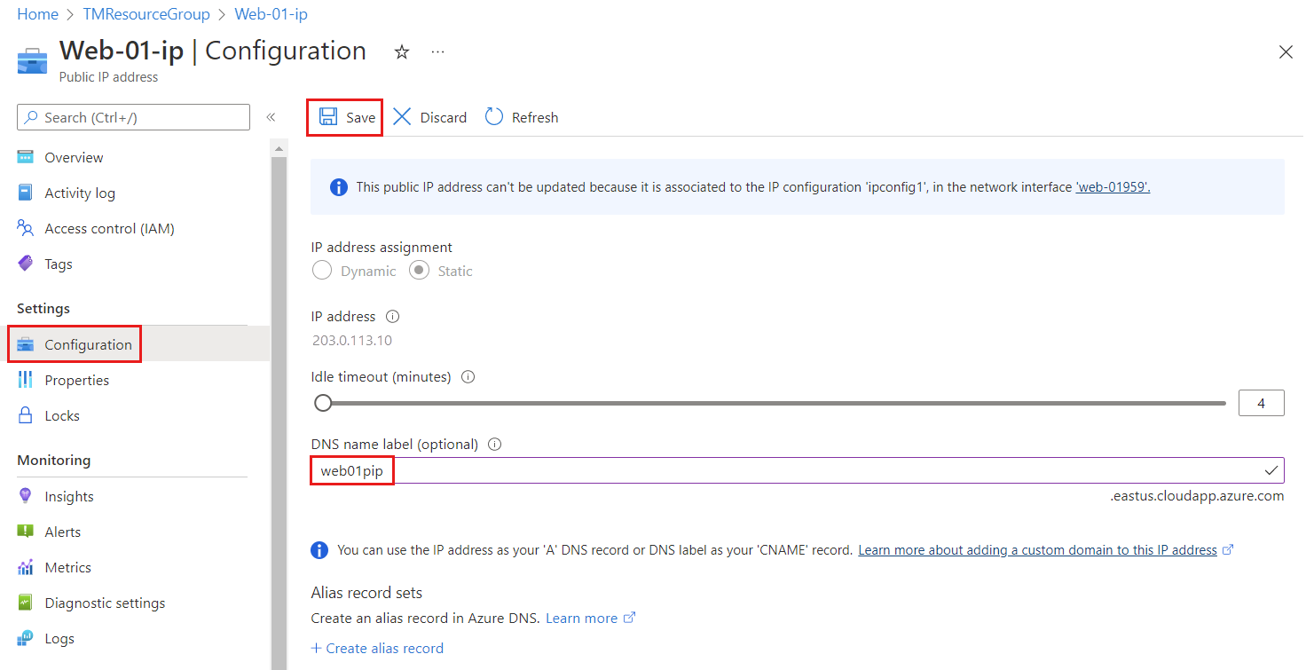 在 TMResourceGroup 资源组中,选择 Web-01-ip 公共 IP 地址。