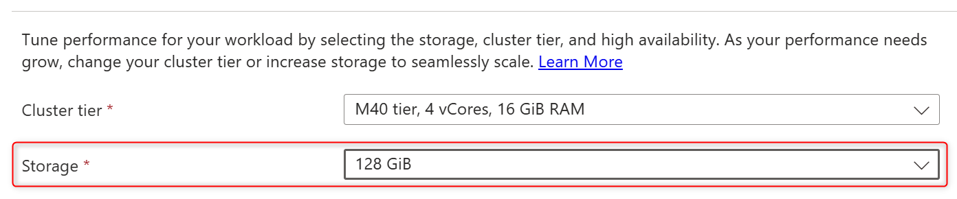 若要增加群集存储大小,请使用 update 操作更新现有群集,方法是增加属性中的 storage.sizeGb 值。 支持的存储大小已在支持的存储页面上列出。