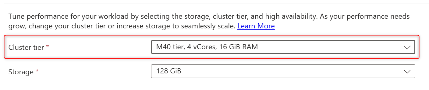 群集层允许配置群集物理分片上的 vCore 数量和 RAM 数量。 可以随时根据需要更改群集层,而无需中断。 例如,可以从 M50 增加到 M60 或从 M50 减少到 M40。