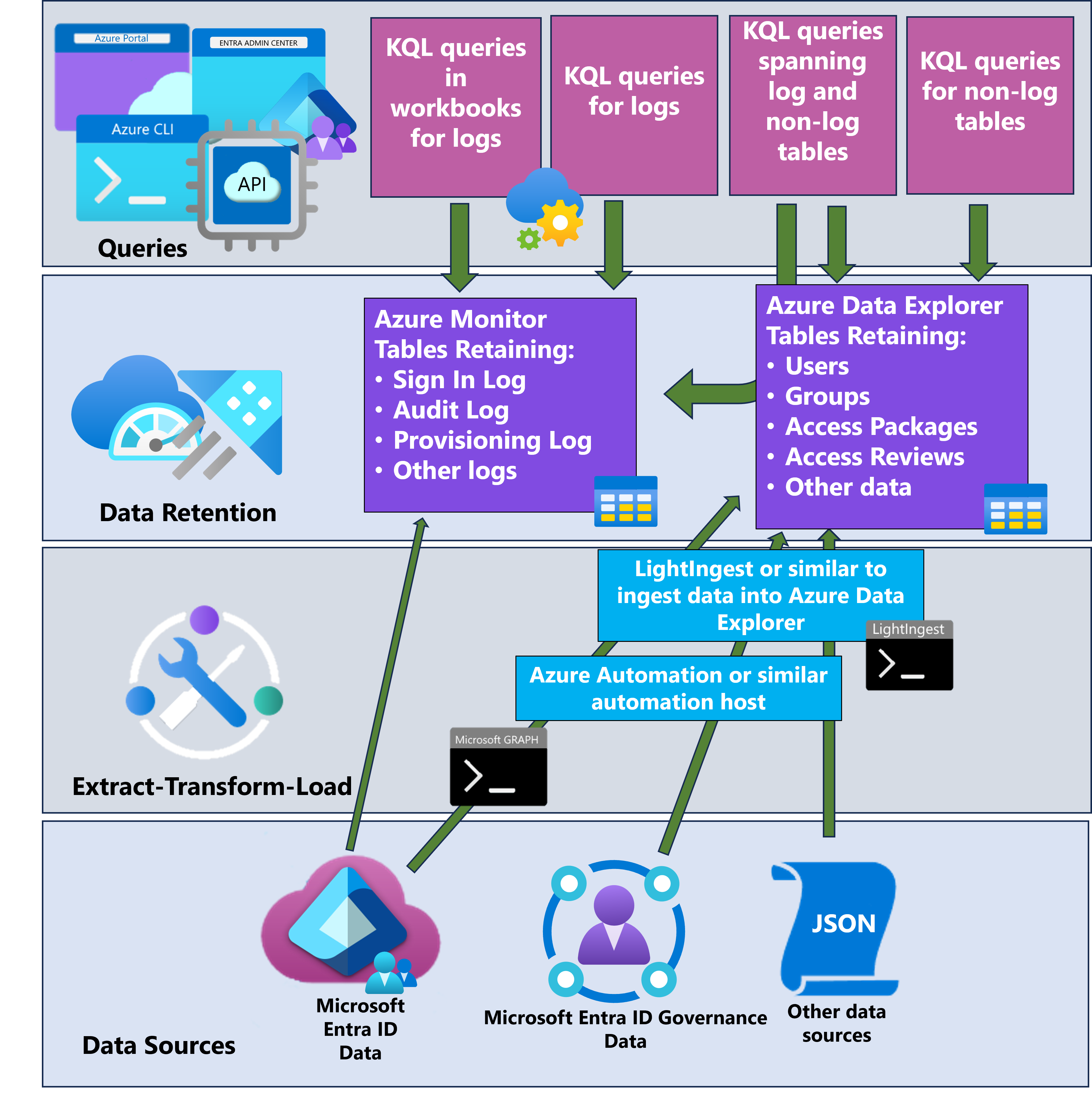 本教程补充了报告选项,例如 使用 Azure Monitor 进行存档和报告以及权利管理,重点介绍如何将审核日志导出到 Azure Monitor 进行保留和分析。 相比之下,将 Microsoft Entra ID 和 Microsoft Entra ID Governance 数据导出到 Azure 数据资源管理器可以灵活地针对 Microsoft Entra 对象(包括历史对象和已删除对象)创建自定义报表。