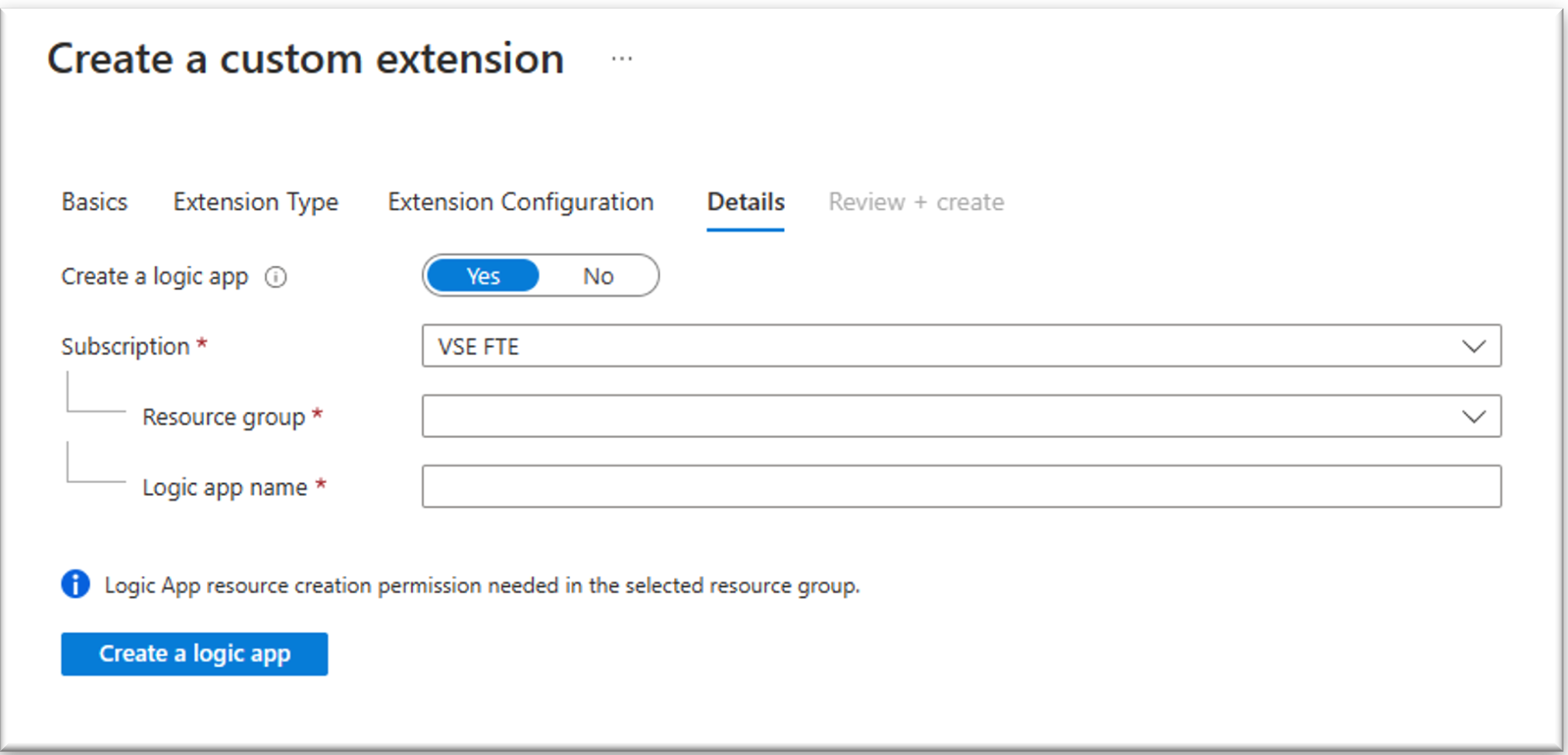 在“审阅并创建”中,查看自定义扩展的摘要,确保逻辑应用标注详细信息正确无误。 然后选择“创建”。