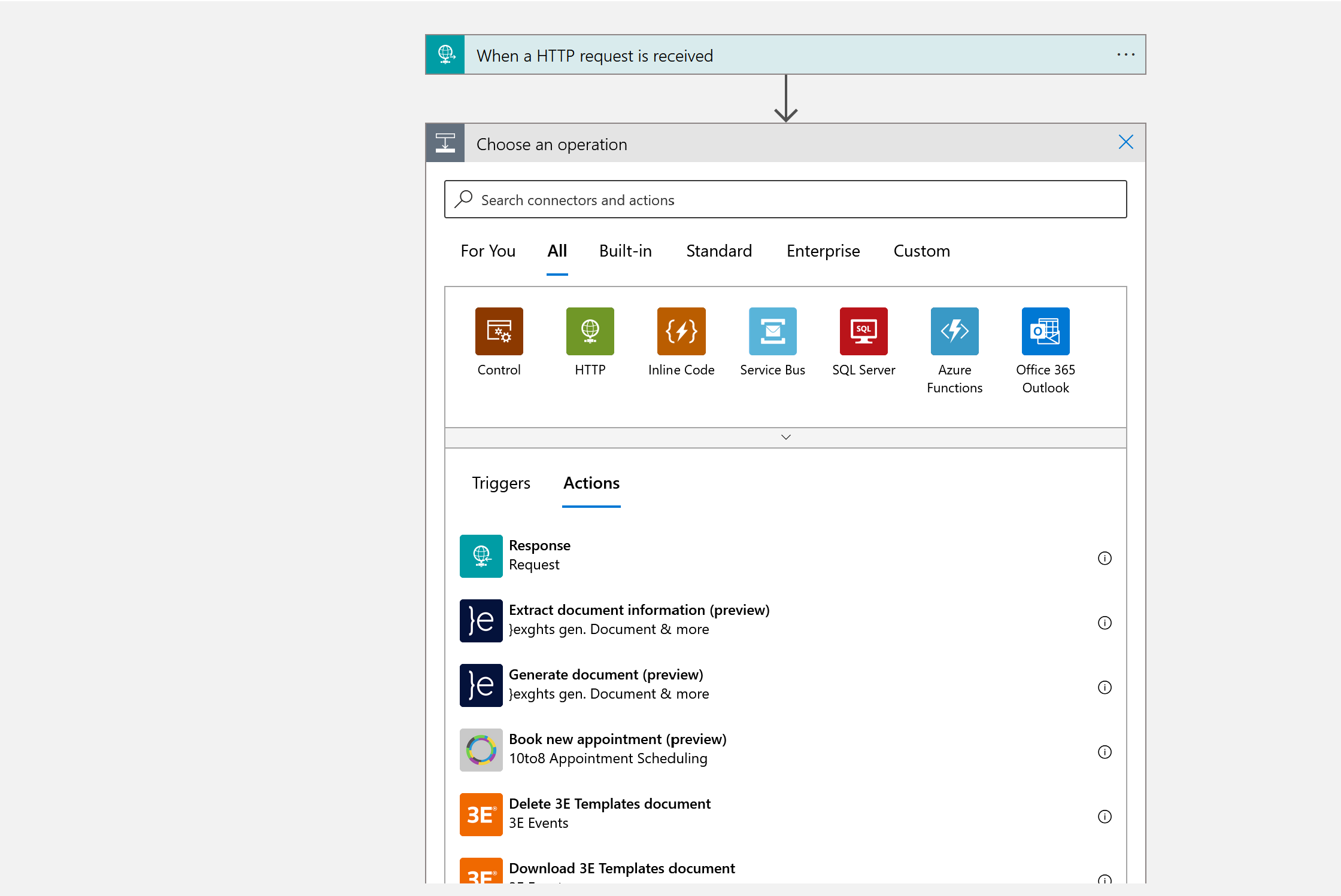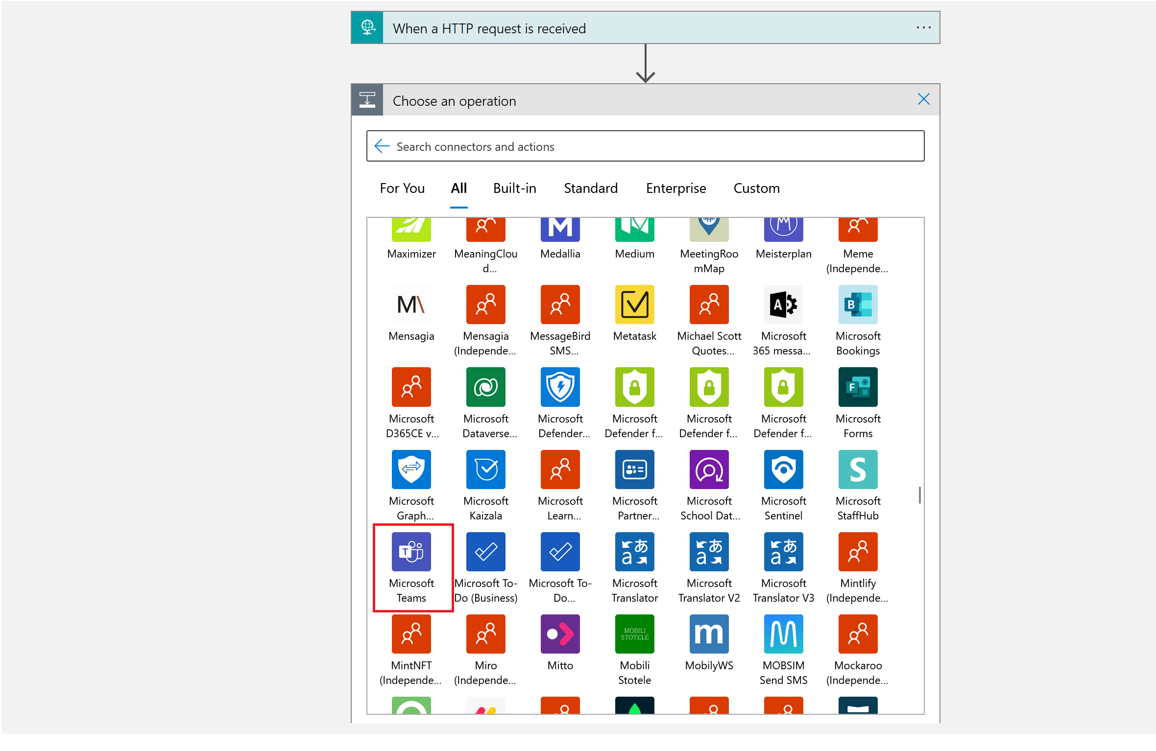 - 选择“新建步骤”,会打开一个对话框,然后选择“全部”并展开连接器列表。