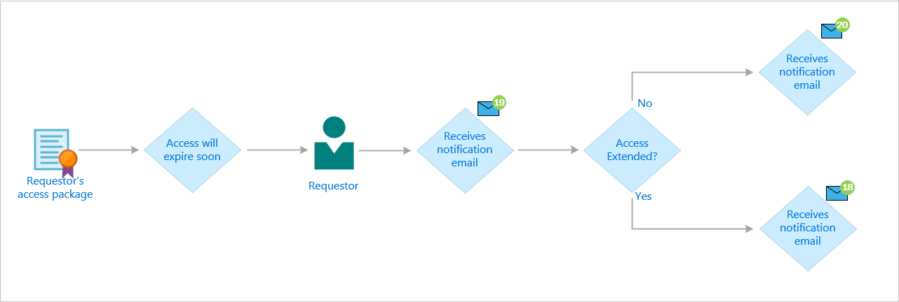| 19 | 将 [access_package] 的访问权限延长至 [date] | 在最终用户的访问权限过期之前,他们会收到此电子邮件。 默认情况下,使用权利管理禁用电子邮件功能禁用此功能。 | 请求者 |