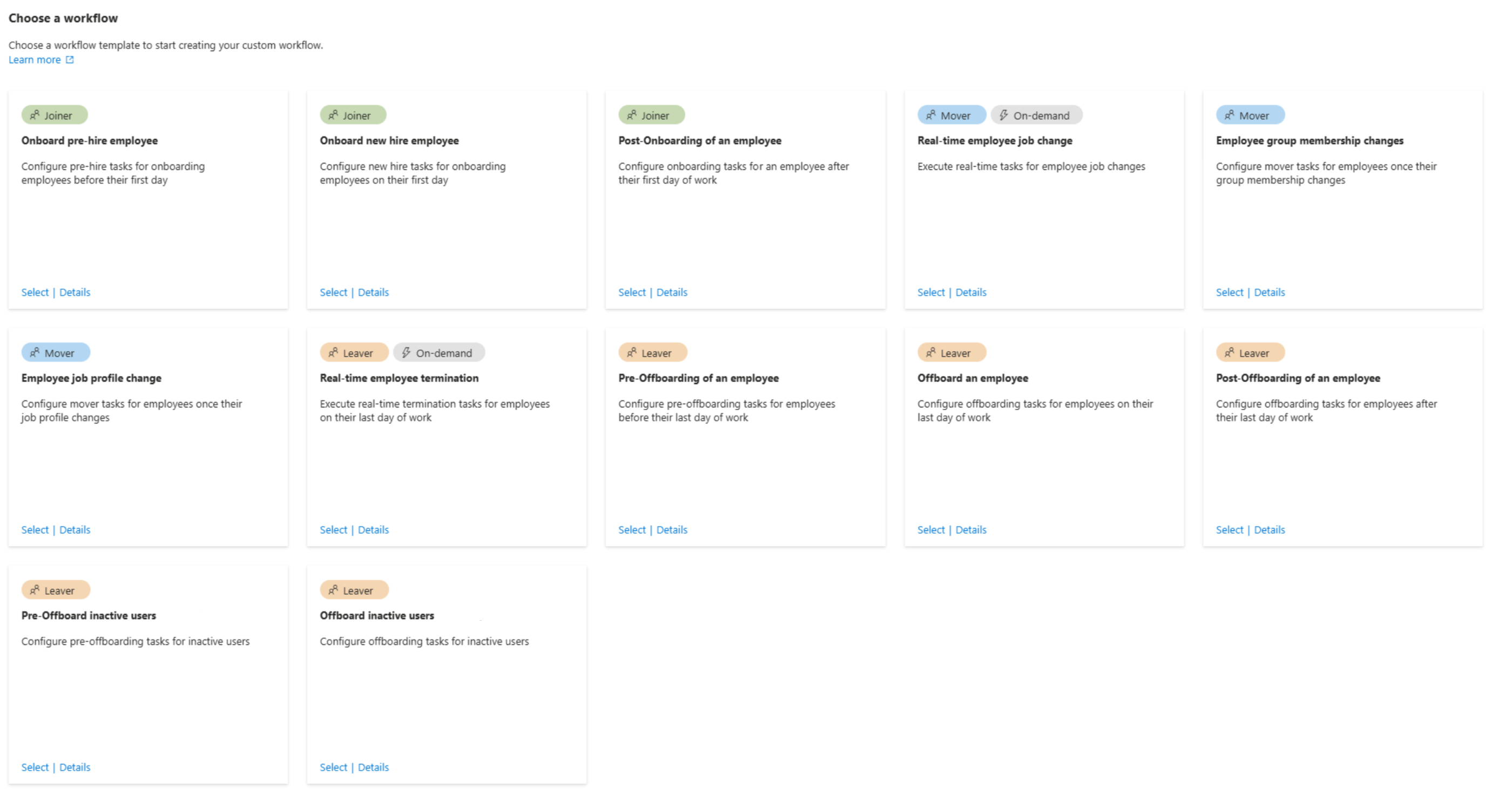 使用生命周期工作流,可以通过创建包含内置任务和自定义任务扩展的工作流来自动执行组织的生命周期管理过程。 这些工作流及其中的任务都属于基于 Joiner-Mover-Leaver (JML) 生命周期管理模型的类别。 为了提高此过程的效率,生命周期工作流还提供了模板,可用于加速常见生命周期管理过程的设置、创建和配置。 可以按原样创建基于这些模板的工作流,也可以进一步自定义工作流,以符合组织内用户的要求。 在本文中,可获得工作流模板的完整列表、通用模板参数、特定模板的默认模板参数以及每个模板的兼容任务列表。 有关完整任务定义,请参阅:生命周期工作流任务和定义。