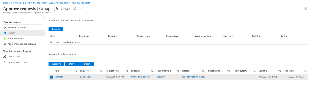 在 “角色激活请求 ”部分中,会看到等待审批的请求列表。