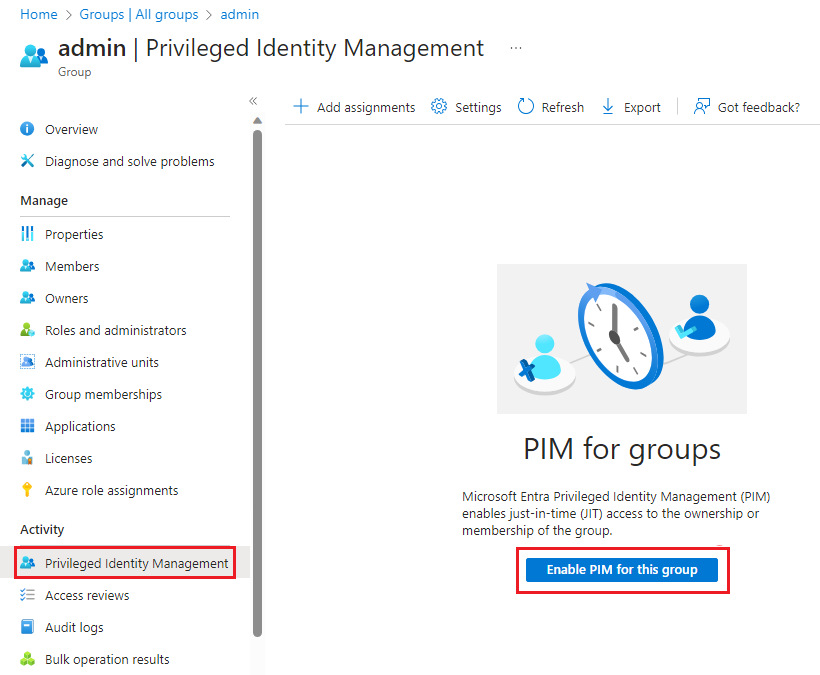 或者,可以使用“组”窗格将组置于 Privileged Identity Management 下。
