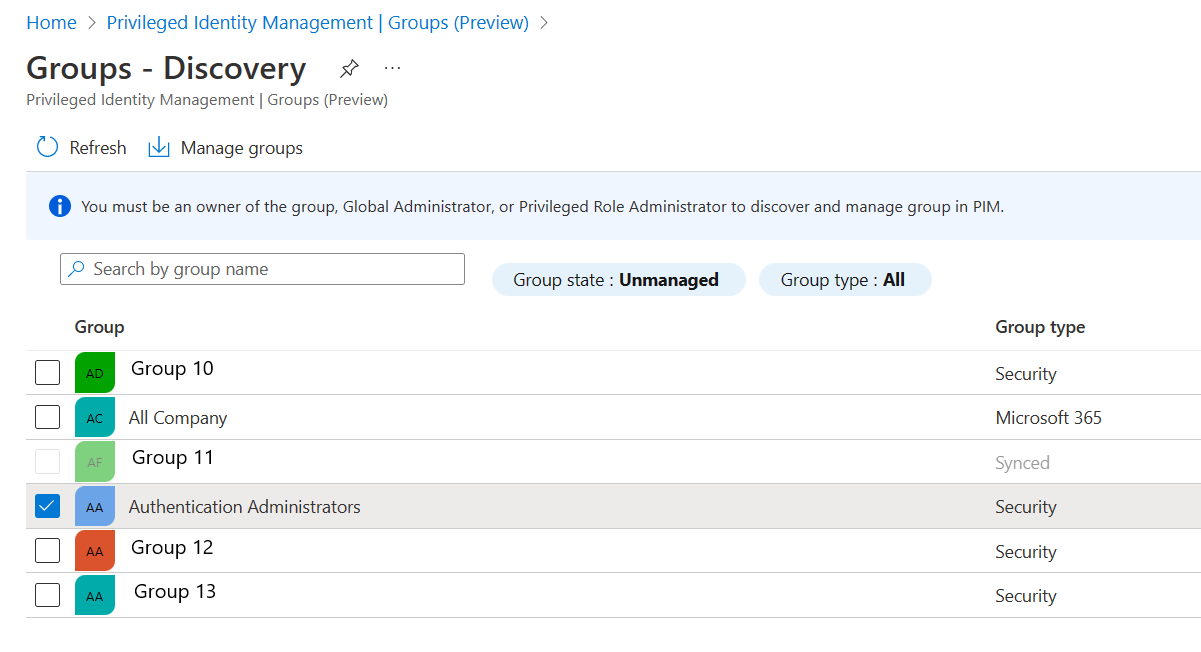 选择“发现组”,然后选择您想要用 PIM 管理的组。