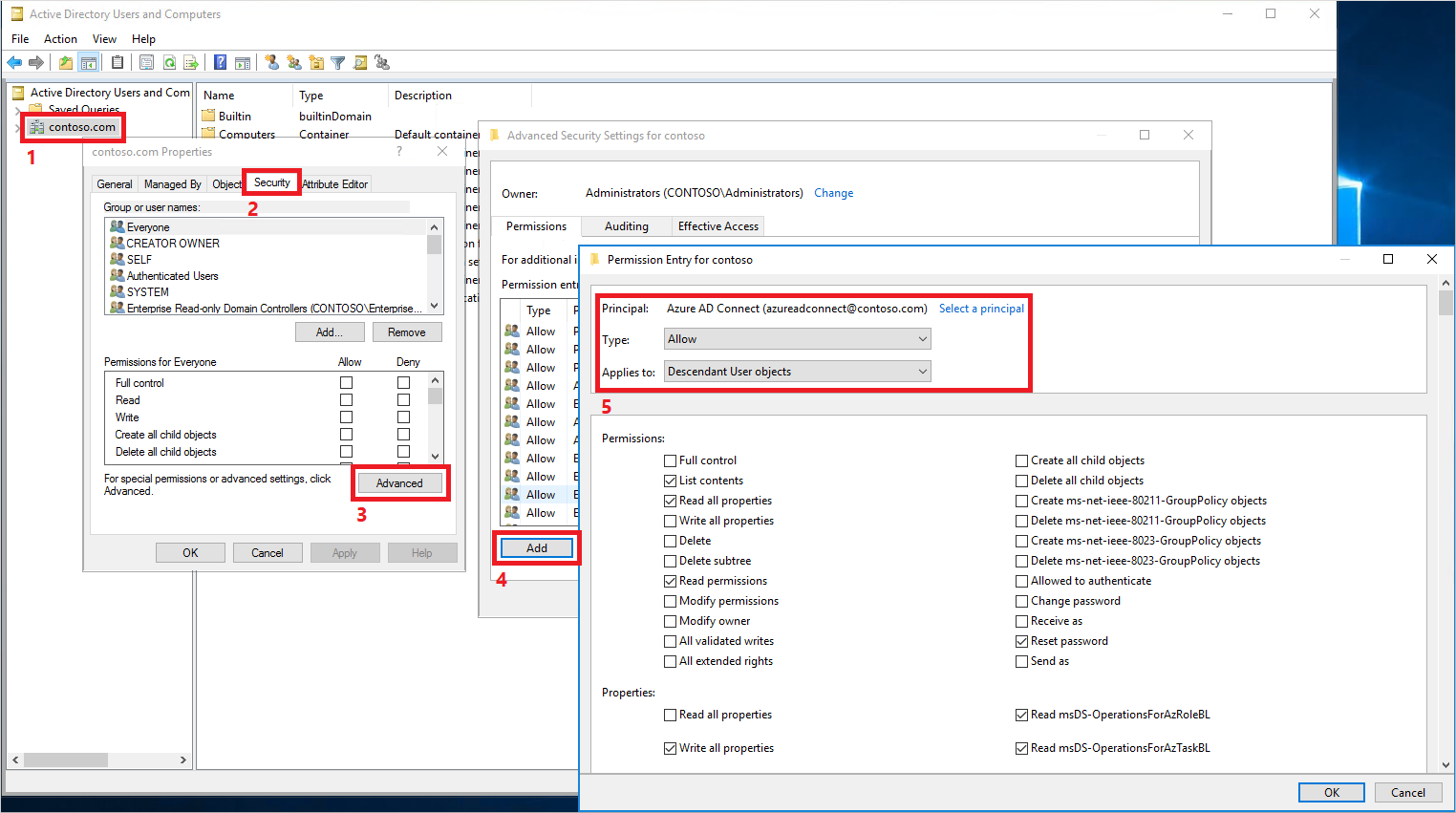 如果某些用户帐户的密码未写回到本地目录,请确保未在本地 AD DS 环境中对帐户禁用继承。 必须将密码的写入权限应用于后代对象,才能使该功能正常工作。