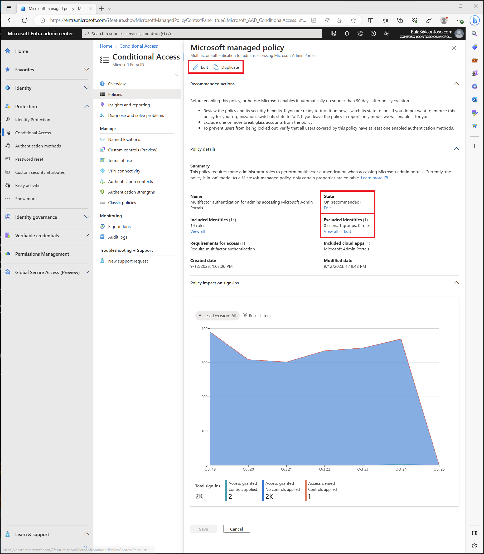 可以编辑策略的状态以及策略应排除的标识。 像其他条件访问策略一样,将中断或紧急访问帐户排除在管理策略之外。 如果需要进行的更改超出 Microsoft 托管策略允许的范围,请考虑复制这些策略。