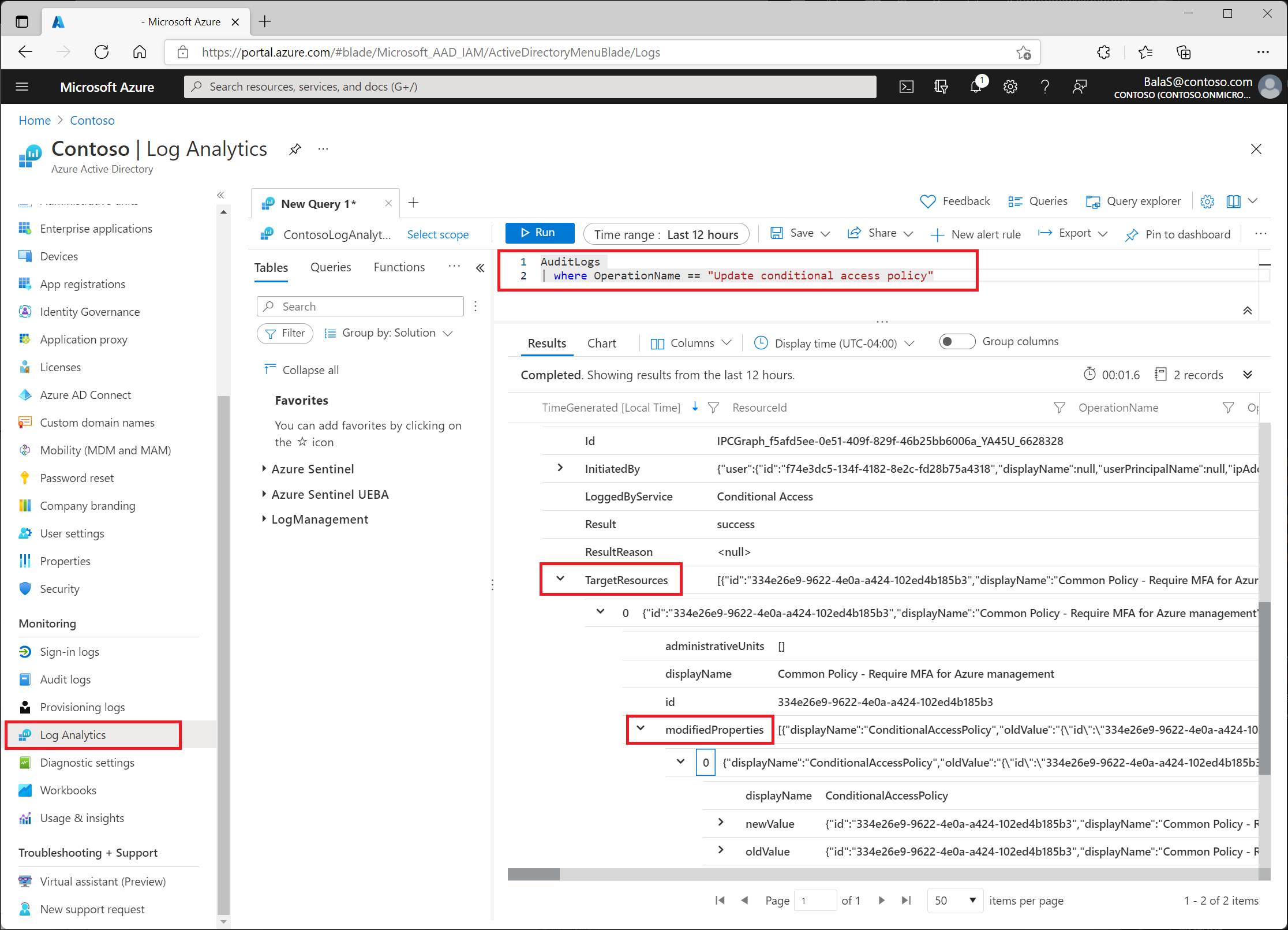 启用后,在 Entra ID>Monitoring & health>Log Analytics 中找到 Log Analytics。 与条件访问管理员最相关的表是 AuditLogs。