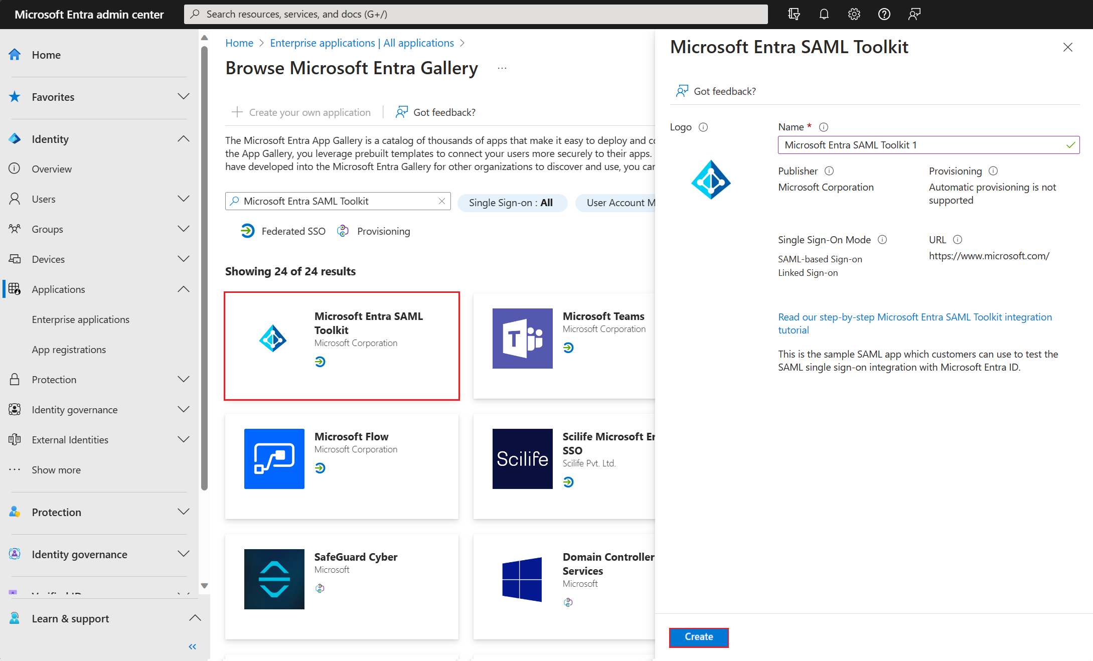 Microsoft Entra SAML Toolkit 1。选择“创建”,将你进入你注册的应用程序。