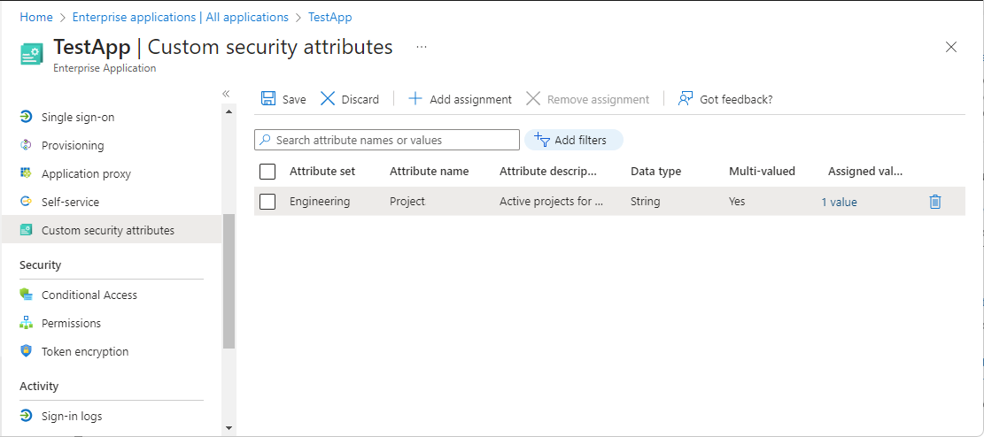 完成后,选择“保存”,将自定义安全属性分配给应用程序。