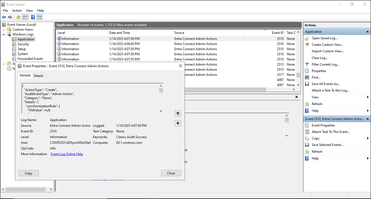 通过 Microsoft Entra Connect 同步向导、PowerShell 或同步规则编辑器(例如同步规则、身份验证设置和联合设置的更新)执行的管理员作在名为 Entra Connect Admin Actions 的专用事件源下捕获并记录在 Windows 事件查看器应用程序的事件日志中。 这将改进对身份基础结构更改的可见性,并支持故障排除、操作责任归属以及法规合规性。