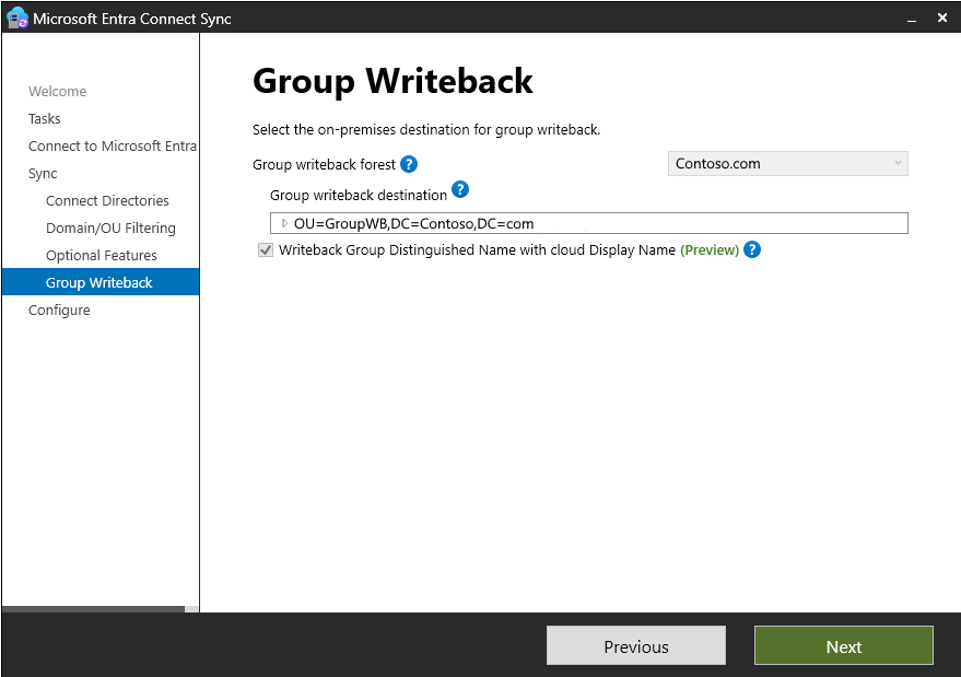 若要更轻松地查找从 Microsoft Entra ID 写回到 Active Directory 的组,请选择“带云显示名称的写回组可分辨名称”选项: