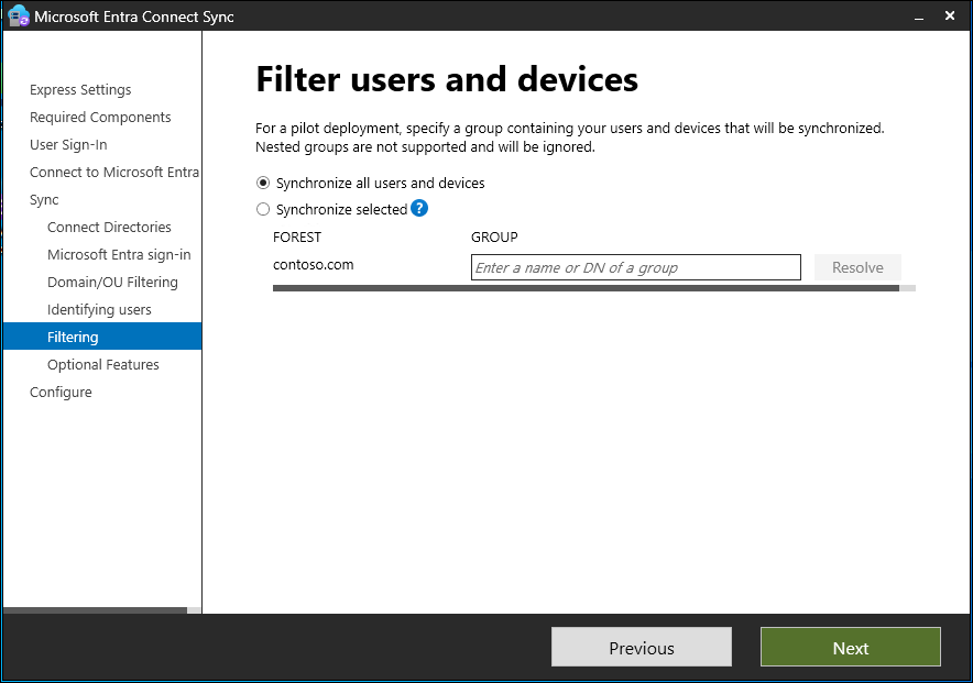使用按组筛选功能可以只同步一小部分的对象来进行试点。 若要使用此功能,请在 Active Directory 本地实例中针对此目的创建一个组。 然后添加应该以直属成员身份与 Microsoft Entra ID 同步的用户和组。 稍后可以在此组中添加或删除用户,以维护应该要在 Microsoft Entra ID 中显示的对象列表。