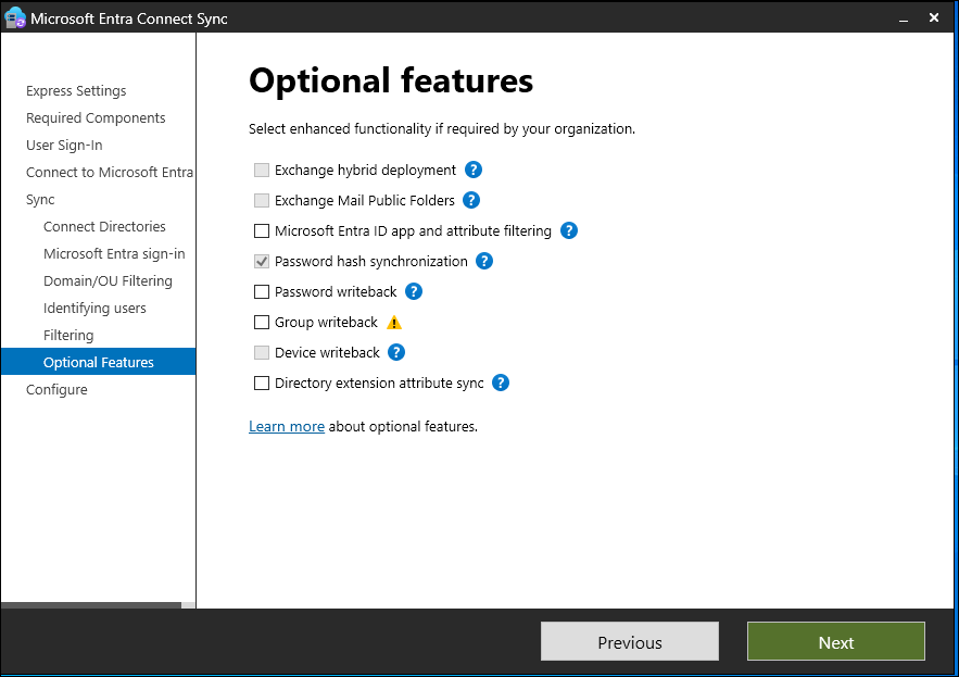 如果 Azure AD Sync 或 Direct Synchronization (DirSync) 处于活动状态,请勿激活 Microsoft Entra Connect 中的任何写回功能。