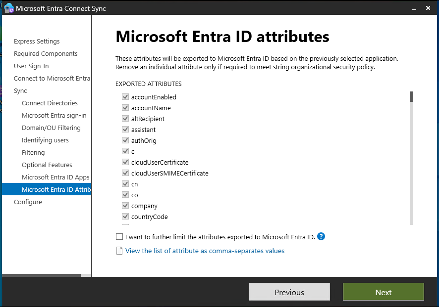 如果想要限制同步到 Microsoft Entra ID 的属性,则可以从选择使用的服务来着手。 如果更改此页上的选项,则必须通过重新运行安装向导来显式选择新的服务。