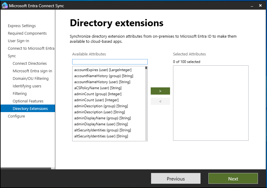 可以使用组织添加的自定义属性或使用 Active Directory 中的其他属性,在 Microsoft Entra ID 中扩展架构。 若要使用这项功能,请在“可选功能”页上选择“目录扩展属性同步”。 可以在“目录扩展”页上选择要同步的其他属性。
