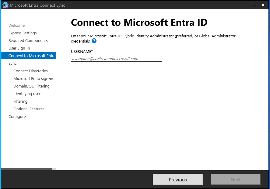 在“连接到 Microsoft Entra ID”页上,输入混合标识管理员帐户和密码。 如果在前一个页面上选择了“使用 AD FS 进行联合身份验证”,则不要使用你计划启用联合身份验证的域中的帐户登录。
