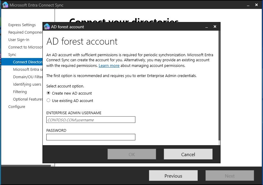 | 创建新帐户 | 创建 AD DS 帐户,Microsoft Entra Connect 在目录同步期间需要使用该帐户来连接到 Active Directory 林。 选择此选项后,请输入企业管理员帐户的用户名和密码。 Microsoft Entra Connect 使用提供的企业管理员帐户创建所需的 AD DS 帐户。 可以采用 NetBIOS 格式或 FQDN 格式输入域部分。 即,输入 FABRIKAM\administrator 或 fabrikam.com\administrator。 |