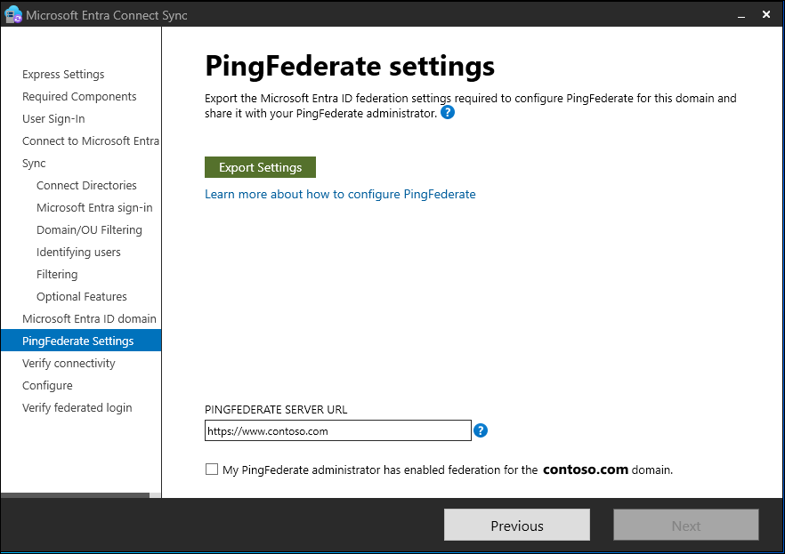将 PingFederate 配置为每个联合 Azure 域的联合服务器。 选择“导出设置”,以便与 PingFederate 管理员共享此信息。 联合服务器管理员会更新配置,然后提供 PingFederate 服务器 URL 和端口号,以便 Microsoft Entra Connect 可以验证元数据设置。