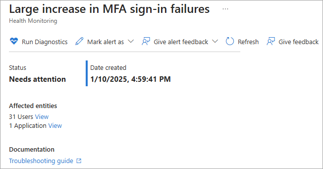 信号和警报在 Microsoft Entra 管理中心的 Microsoft Entra 健康区域可用。 无论是对警报进行调查还是只是监控租户的健康状况,您都可以在Microsoft Entra管理中心查看信号与警报。