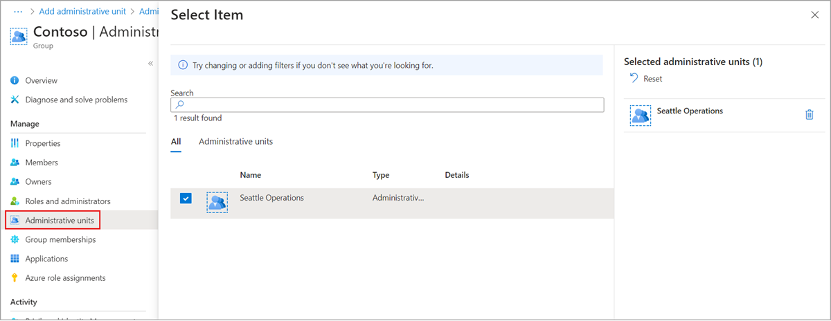 在 Microsoft Entra ID 中,可将用户、组或设备添加到管理单元,以限制角色权限的范围。 将组添加到管理单元会将该组本身纳入管理单元的管理范围,但不包括该组的成员。 有关范围内的管理员可以执行哪些操作的其他详细信息,请参阅 Microsoft Entra ID 中的管理单元。