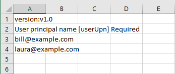 在每行中添加一个用户主体名称 (UPN)。 请勿删除模板的前两行。