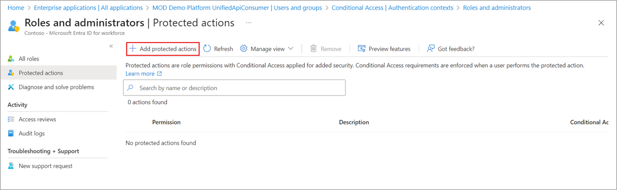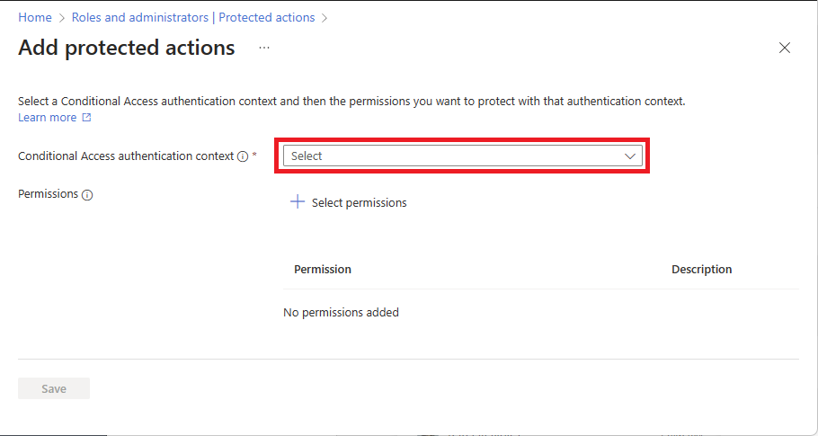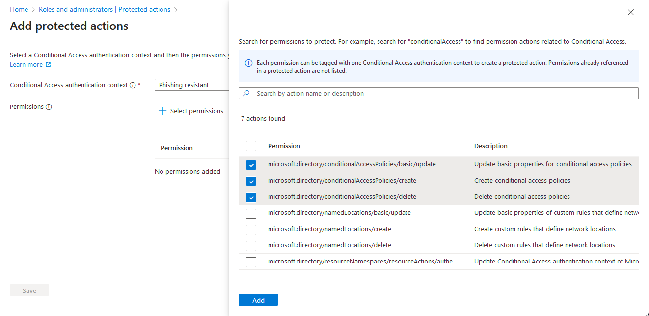 如果“添加受保护操作”处于禁用状态,请确保已为你分配条件访问管理员或安全管理员角色。 有关详细信息,请参阅对受保护操作进行故障排除。