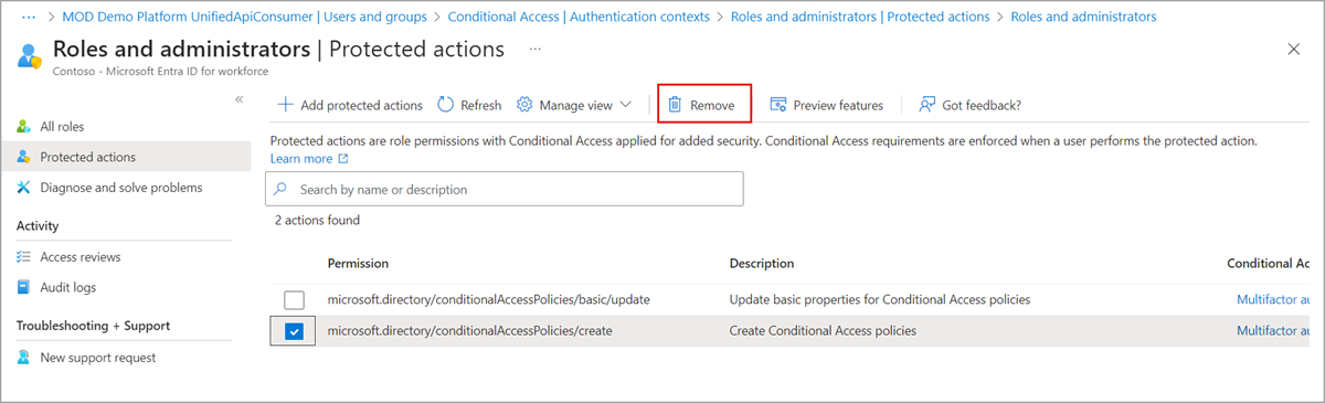 删除受保护的操作后,权限将没有条件访问要求。 可以向权限分配新的条件访问策略。