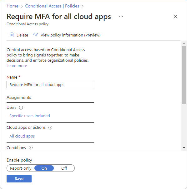 条件访问策略未创建,或者策略状态为“关闭”或“仅限报告”。