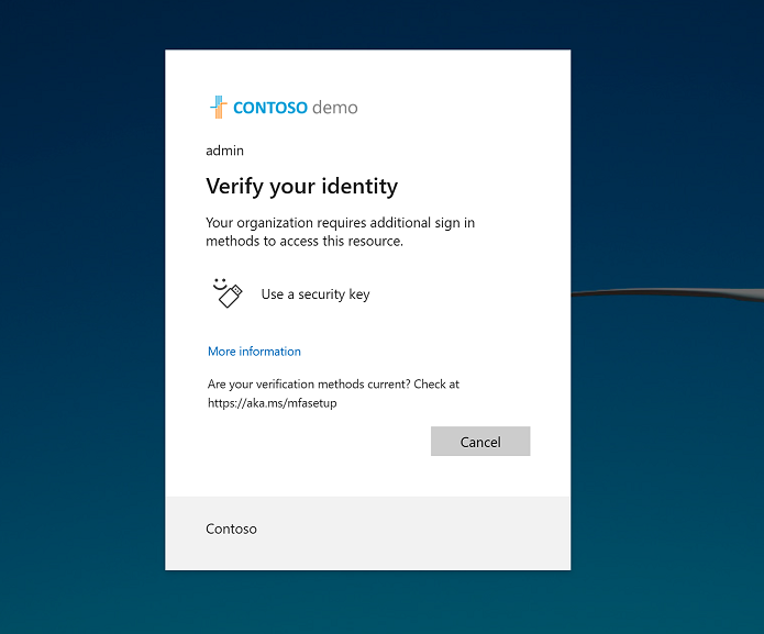 用户执行受保护操作时,需要满足条件访问策略。 此部分显示用户收到满足策略的提示时的体验。 在此示例中,用户需要先使用 FIDO 安全密钥进行身份验证,然后才能更新条件访问策略。