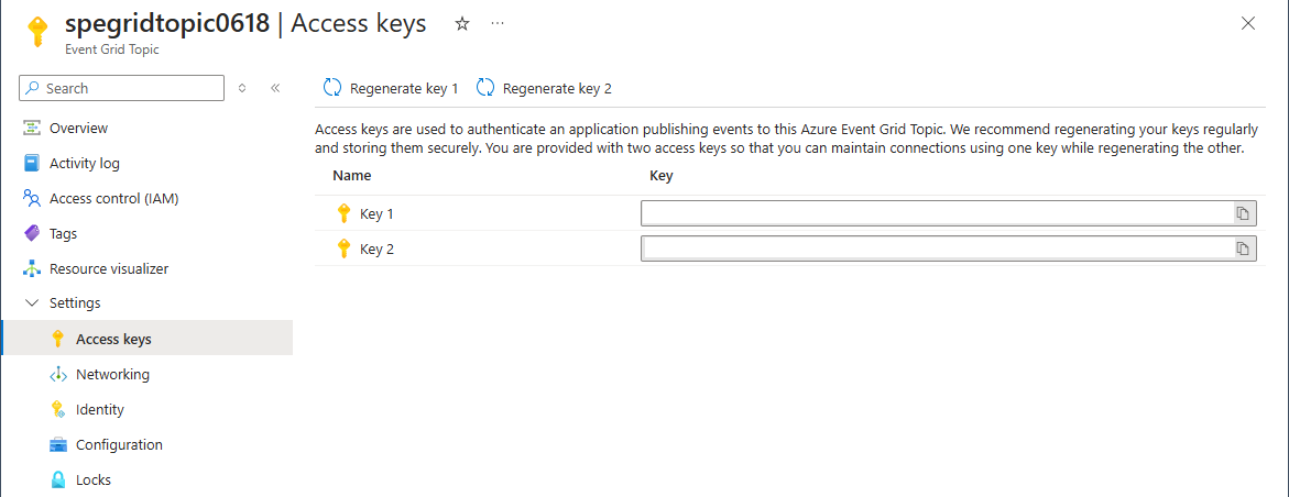 若要获取自定义主题的访问密钥,请在 Azure 门户中的“事件网格主题”页面上选择“访问密钥”选项卡。