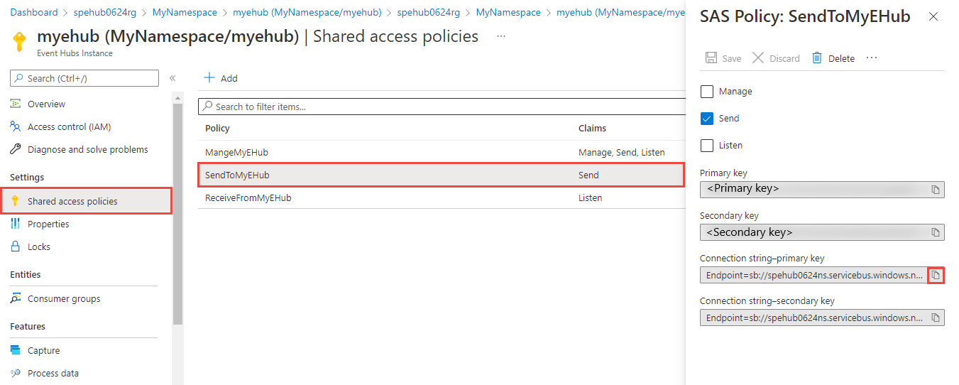 Get-AzEventHubKey -ResourceGroupName MyResourceGroupName -NamespaceName MyNamespaceName -EventHubName MyEventHubName -AuthorizationRuleName MyAuthRuleName