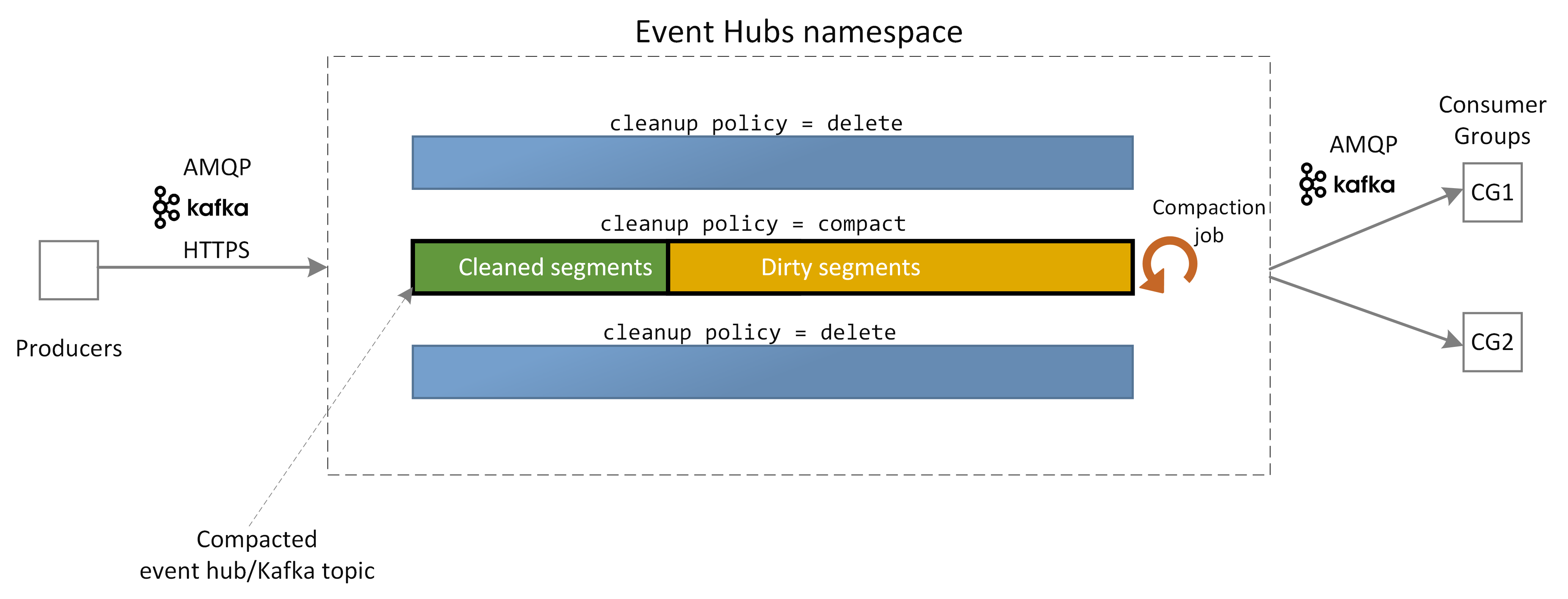 可以在每个事件中心/Kafka 主题级别启用日志压缩。 可以从任何受支持的协议将事件引入压缩实体。 Azure 事件中心服务对每个压缩的事件中心运行压缩作业。 压缩作业通过仅保留给定事件键的最新事件来清理每个事件中心分区日志。