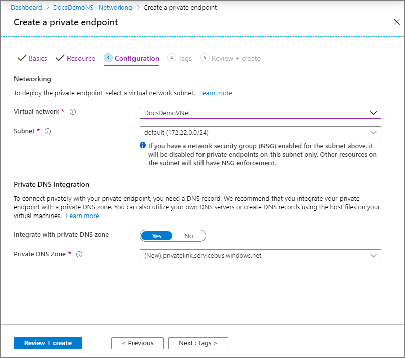 在 DNS 页上,选择是否希望专用终结点与专用 DNS 区域集成,然后选择“ 下一步:标记”。