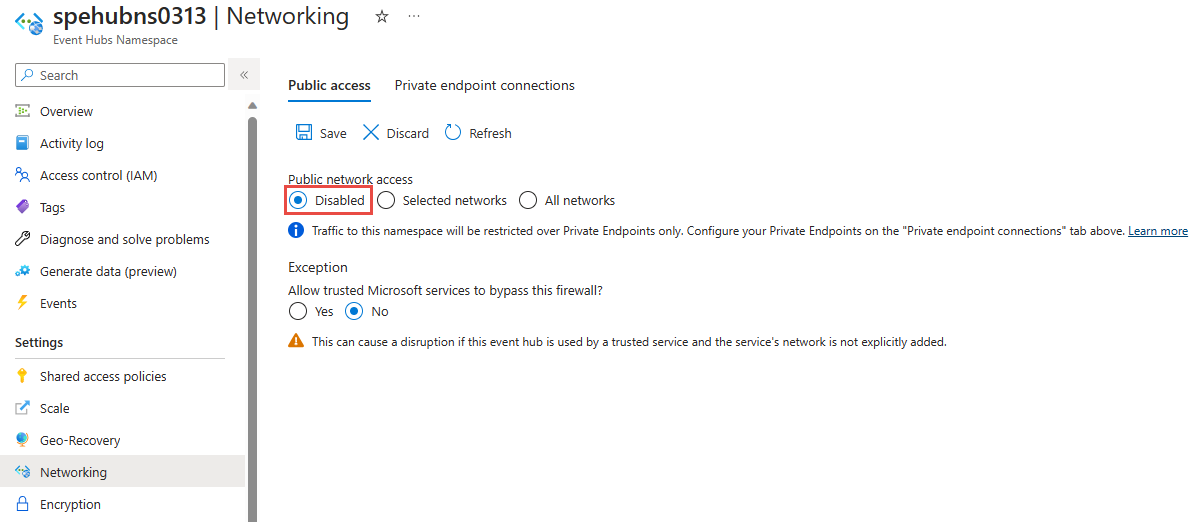 在“网络”页上,对于“公用网络访问”,如果希望仅通过专用终结点访问命名空间,请选择“已禁用”。