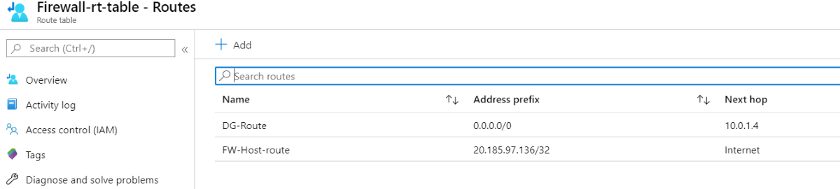 例如,以下路由表显示公共 IP 地址为 203.0.113.136 的防火墙的路由,专用 IP 地址为 10.0.1.4。