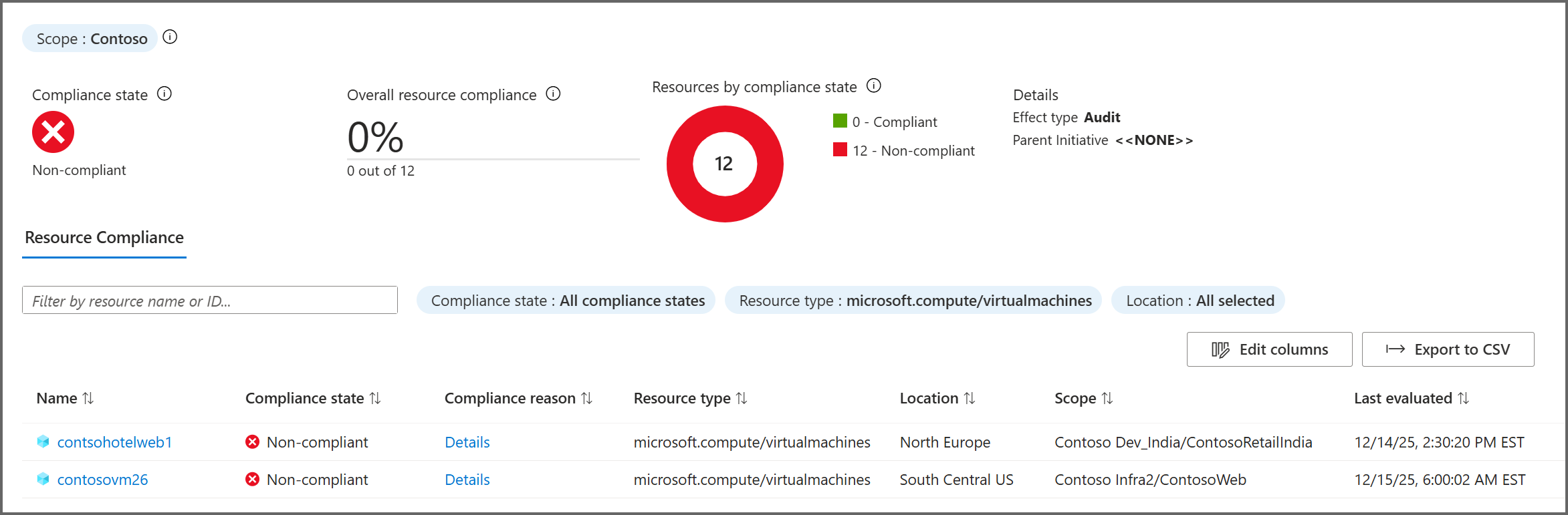 由于策略或计划可分配到不同的范围,因此表中包含每个分配的范围,以及分配的定义类型。 还提供每个分配项中不合规资源和不合规策略的数量。 选择表中的某个策略或计划可以更深入地了解该特定分配的合规性。