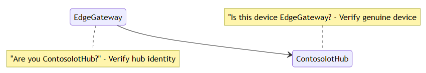 为了帮助你了解 IoT Edge 证书的概念,假设一个名为 EdgeGateway 的 IoT Edge 设备连接到一个名为 ContosoIotHub 的 Azure IoT Hub。 在此示例中,所有身份验证都使用 X.509 证书身份验证,而不是对称密钥。 若要在此方案中建立信任,必须确保IoT Hub和IoT Edge设备是真实的:“此设备是否真实且有效?”以及“IoT Hub的标识是否正确?”下面是方案的图示: