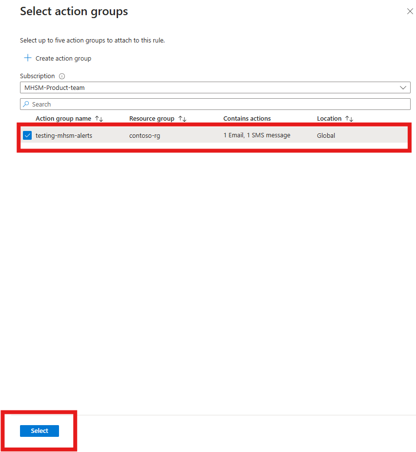 选择要应用于警报规则的操作。 本示例将添加一个现有操作组。 选择操作组,然后选择“选择”。