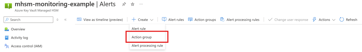 在 Azure 门户中选择 HSM 资源,然后选择“监控”下的“警报”。