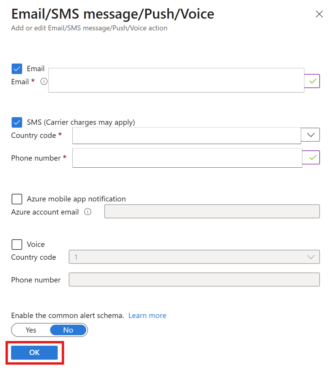为操作组选择“通知类型”。 本示例将创建电子邮件和短信提示。 选择“电子邮件/短信/推送/语音”。