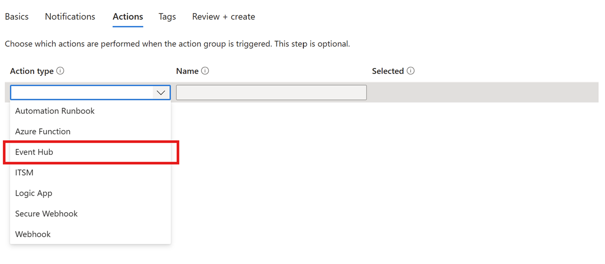 为操作组选择“操作类型”。 在这个例子中,我们创建一个 Event Hubs 操作。 选择“事件中心”。