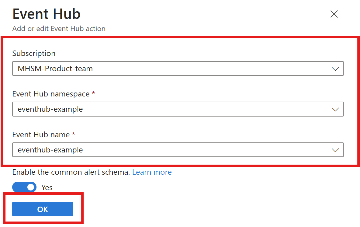 输入事件中心命名空间和名称,然后选择“确定”。