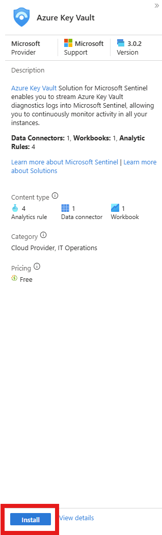 使用 Microsoft Sentinel,可以自动检测 Azure 资源上的可疑活动。 Microsoft Sentinel 附带了许多适用于 Azure 服务的现用连接器,这些连接器实时集成。 可以在 Microsoft Sentinel 内容中心中找到用于保护 Azure Key Vault 的具体“解决方案包”。 也可以将其用于托管 HSM。 但是,需要执行一些关键步骤来确保正确将其用于托管 HSM。