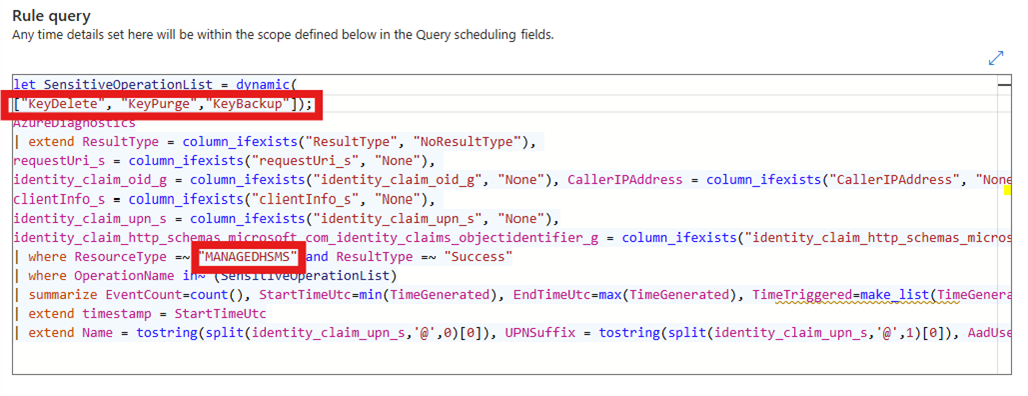 在“设置规则逻辑”选项卡中,编辑规则查询。 将“VAULTS”更改为“MANAGEDHSMS”。 在本例中,我们还更改了