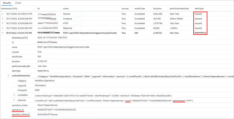 union requests, dependencies | where operation_Id contains "<runId>"此查询使用并集运算符从请求表和依赖项表返回记录。 该查询还使用 operation_Id 属性值通过指定所需的工作流 runId 值来提供记录之间的链接,例如: