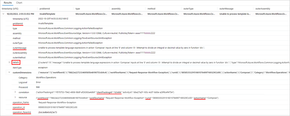 properties 说明 problemId 异常类型,或有关发生的异常的简短描述 outerMessage 有关异常的更详细描述 详细信息 有关异常的详细且最完整的信息 clientTrackingId 客户端跟踪 ID(如果已指定) workflowId 遇到异常的工作流的 ID workflowName 遇到异常的工作流的名称 runId 工作流运行实例的 ID actionName 因异常而失败的操作的名称 operation_Name 遇到异常的工作流的名称 operation_Id 刚刚运行的组件或工作流的 ID。 此 ID 与工作流运行实例的 runId 值相同。 此值超越表,因此你可以将此异常记录与工作流运行实例链接。 operation_ParentId 调用操作的工作流的 ID,你可以将其链接到请求表中的操作 ID 若要查看特定工作流的异常,请创建并运行以下查询: