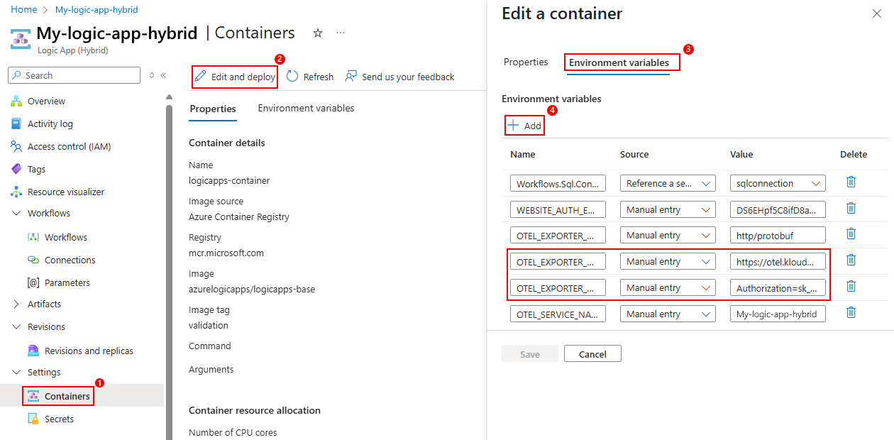 在 “编辑容器 ”窗格中,选择 “环境变量”,然后选择“ 添加” ,以便可以添加以下应用设置:
